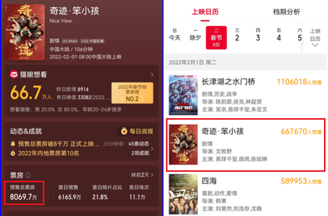 正因如此,《奇迹·笨小孩》一直备受影迷关注,自今年春节档开启预售以来,其预售排片占比、总预售票房、各大网络售票平台想看人数始终位居第二名,仅次于《长津湖之水门桥》。截至1月30日,该片总预售票房突破8000万元,成为今年春节档第二大热门影片。