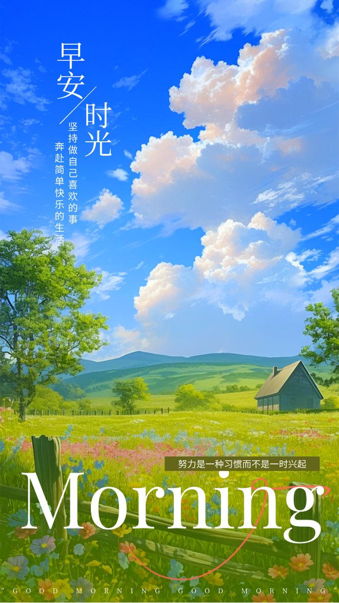 早上好,一个希望,一个梦想,不管昨天怎样低落,总会看见太阳的升起;不管昨天怎样困苦,总会拥有今天的希望,大地因有绿色,而生机勃勃;天空因有云朵,而神采奕奕;人生因有梦想,而充满动力,不怕每天迈一小步,只怕停滞不前;不怕每天做一点事,只怕无所事事,坚持,是生命的一种毅力!早上好!